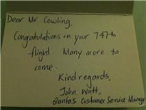Today I received a card and a model 747 from John Watt of Qantas Customer Services to commemorate my 747th flight on a 747. (See earlier blog post)